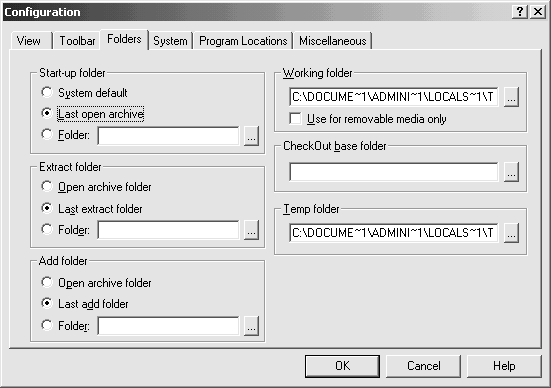 By default, WinZip uses the same folder as both its working folder and temporary folder. There really is no need to change this because these two folders are essentially the same thing. However, for some operations involving floppy disks, WinZip will try to store temporary folders on the floppy disks, which can cause problems if the floppy runs out of space. Using the Working folder Use for removable media only option lets you to tell WinZip where to place temporary files to avoid running out of space on a floppy disk.