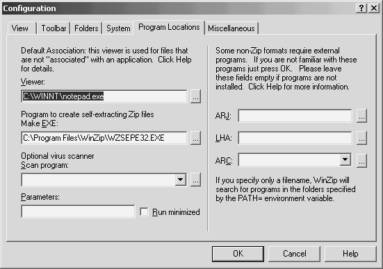 - Program Locations. Allows you to configure other programs to work with WinZip, such as your virus scanner.