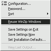 You can set up WinZip so that it will allow you to run only one copy at a time or as many copies as you want. Choose between these options by selecting or clearing the Reuse WinZip Windows option on the Options menu, as shown in Figure 6-12. When this option is selected, you can open multiple copies of WinZip simultaneously.